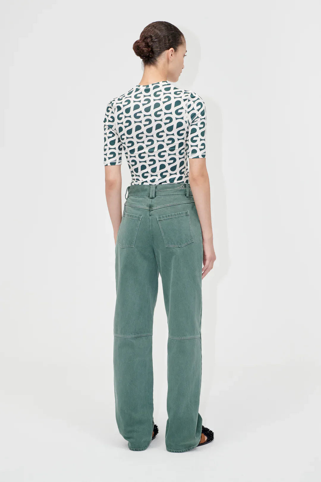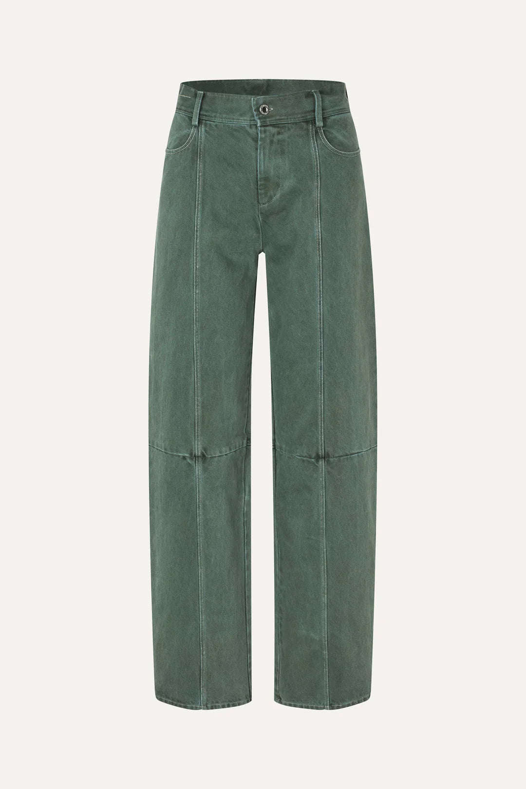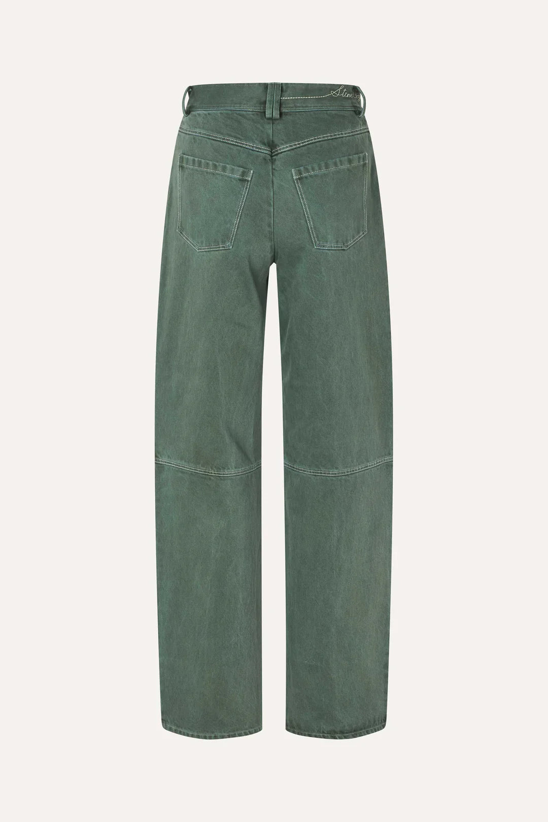 מכנסי דנים ירוקים מבית המותג סטינה גויה. עשויים כותנה אורגנית עם תפרים לבנים. המכנסיים בגזרה ישרה, כוללים כיסים קדמיים ואחוריים, סגירת רוכסן ולוגו STINE GOYA רקום על החגורה.